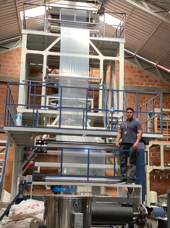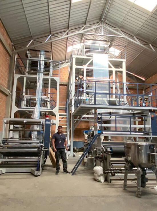 玻利維亞拉巴茲當(dāng)?shù)匾患倚⌒鸵?guī)模吹膜廠,從我們PLASTAR公司購買過2臺吹膜機(jī),一臺單層1000mm吹膜機(jī),另一臺為單層1500mm吹膜機(jī)。客戶沒要求我們派遣工程師,全部都由客戶自行組裝,并且試機(jī)驗收。目前機(jī)器運(yùn)轉(zhuǎn)良好,客戶主要做大型食品袋子和貨物袋子。